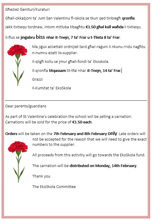 Bħala attivita` għal Jum il-Mara nixtiequ ninfurmawkom li l-Kunsill Skolastiku se jorganizza l-bejgħ ta’ pjanti (Kalanchoe). Kull pjanta tiswa €2.50. Jekk tkunu tridu tordnaw jekk jogħġobkom ibagħtu l-ammont eżatt mat-tfal f’dawn il-ġranet biss: it-Tnejn 21 ta’ Frar, it-Tlieta 22 ta’ Frar jew l-Erbgħa 23 ta’ Frar. Minħabba ċ-ċirkostanzi li ninsabu fihom, mhux ser jitqassmu karti.