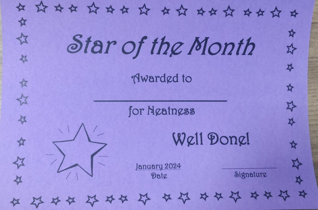 Each month, a Star of the Month certificate is awarded to a student in each class, recognizing their progress in various areas like assisting others, fostering friendships, and more.