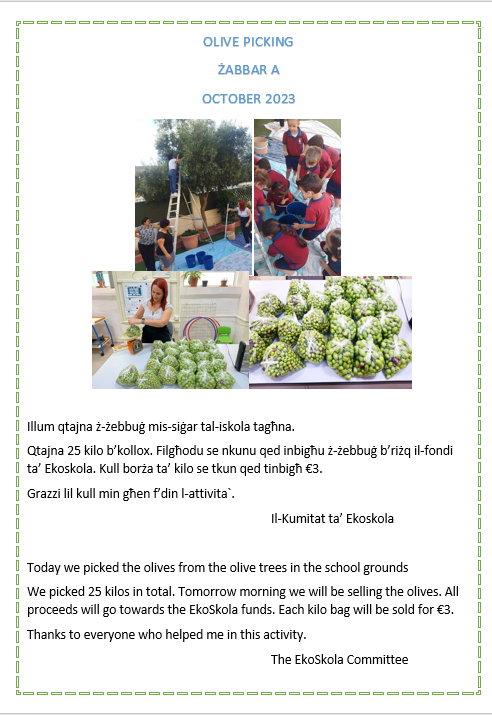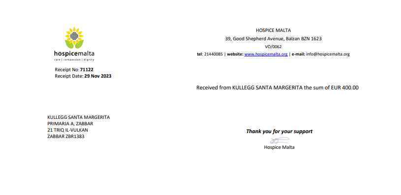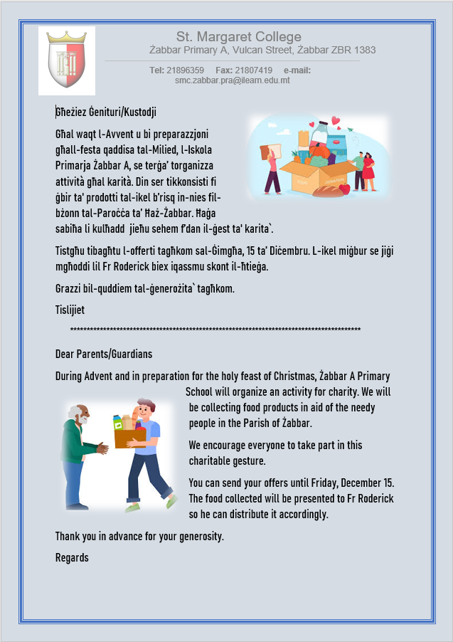 Bħala ‘fund raising’ għall-iskola, dis-sena ħsibna biex noffru l-opportunita’ lit-tfal biex it-Tnejn 18 ta’ Diċembru jilbsu flokk bit-tema tal-Milied għal donazzjoni ta’ 1 Ewro. Jistgħu jilbsu ukoll flokk aħmar, aħdar jew kulur ieħor assojat mal-Milied u jeans.